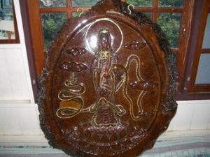 ปุ่มไม้มะค่าแกะสลักรูปเจ้าแม่กวนอิม หายากมากมีชิ้นเดียวในโลก ขนาดสูง 52 นิ้ว กว้าง 42 นิ้ว ไม้ปุ่มขนาดนี้ต้นไม้ต้องมีอายุไม่ต่ำกว่า150 ปี แกะสลักได้งดงามมากเหมาะสำหรับบ้านเศรษฐีมีไว้ประดับบารมีและเป็นสิริมงคล แก่เจ้าของ ราคาคุยกันได้