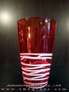 งานแก้ว ซึ่งเป่าโดยผู้เชี่ยวชาญ ตัวแก้วน้ำเป็นสีแดง พันด้วยเส้นสีขาว สวยเก๋ไม่เหมือนใคร