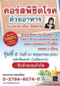 กลับมาอีกครั้งกับคอร์สพิชิตโรคด้วยอาหาร เพื่อ สุขภาพ หลังจากที่ประสบความสำเร็จไปแล้วกับคอร์ส รู้แล้วลดได้สไตส์คุณ รุ่น1 มาคราวนี้ท่านจะได้เข้า คอร์ส เพื่อ สุขภาพ กับ รศ.ดร.ปรียา ลีฬหกุล นักวิชาการด้านโภชนบำบัด ตลอดระยะเวลาการทำงานที่ผ่านมากว่า 20 ปีนี้ อาจารย์ได้สะสมประสบการณ์มามากมายเกี่ยวกับ โภชนาการ การใช้ อาหาร ที่ปกติเรารับประทานกันอยู่นี้ในการ ป้องกัน รัก ษา และสนับสนุน ตลอดจนอาหารที่เหมาะสมในวัยและภาวะต่างๆ