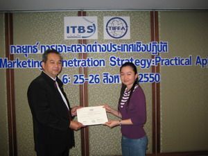 เข้าร่วมสัมมนาในหัวข้อเรื่อง "กลยุทธ์ การเจาะตลาดต่างประเทศเชิงปฏิบัติ" รุ่น 7 ในวันที่ 14-15 มิถุนายน พ.ศ. 2551 เวลา 09.00-16.00 น. (12 ชั่วโมง) ณ Windsor Suites Hotel (สุขุมวิท 18-20)