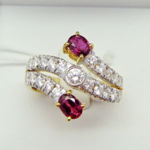 พลอยทับทิม เจียรรูปไข่ จำนวน 2 เม็ด ฝังที่ปลายวงแหวนทั้ง 2 ด้าน น้ำหนักรวม 0.63 กะรัต สีและความสะอาด Extra Fine