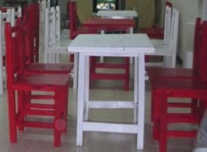 โต๊ะขายอาหารเป็นไม้ และเก้าอี้ไม้สีแดงและขาวมีพนัก 6 ชุด ชุดละ1600 บาท
