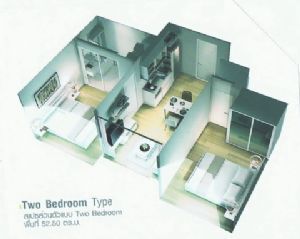 2 ห้องนอน 2 ห้องน้ำ ในเนื้อที่ 52.5 ตรม. จัดแปลนห้องดีเยี่ยม เห็นต้องติดใจ (ไปดูห้องตัวอย่างได้ที่สำนักงานขายโครงการ หรือเข้าไปดูรายละเอียดที่ www.aspace.co.th
