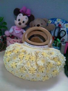 กระเป๋าถักโคเชท์ลายดอกไม้สีเหลืองอ่อน ขนาดพอเหมาะ ทำเองด้วยค่ะ