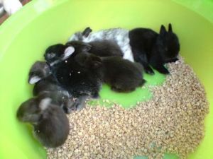 คอกนี้เป็นคอกที่ 2 แล้วค่ะ ตอนนี้อายุประมาณ 17-19 วันค่ะ พ่อพันธุ์เค้าเป็นกระต่ายแคระสีขาวล้วน ตาแดงค่ะ ส่วนแม่เค้าก็สีขาวๆ ปนดำนิดหน่อย แต่พอออกลูกมา เป็นสีดำทั้งคอกเลย มีมีสีผสมกันตัวเดียวเองค่ะ