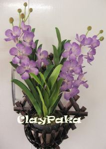 ดอกไม้ประดิษฐ์ดินปั้น กล้วยไม้พันธ์แวนด้า ฟ้ามุ่ย ใส่แจกันไม้ สำหรับแขวนผนัง