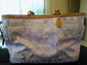 กระเป๋า coach ใบใหญ่ขนาด 35" x 5" cm. สีม่วงอมชมพู น่ารักมากซื้อมาใช้ไม่กี่ครั้งมีเลอะหมึกนิดหน่อยด้านในกระเป๋า สำหรับคนที่ชอบสะพายกระเป๋าใบใหญ่ๆหรือชอบใส่ของเยอะๆ มีหลายช่อง ฝากเพื่อนซื้อมาจาก USA ซื้อมา 2 หมื่น กว่า เมืองไทยไม่เคยมีแบบนี้ ขาย 12,000 บาท ถ้าสนใจโทรมาคุยราคาได้