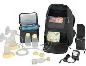 - Medela Pump in Style Double Electric Breastpump with Poly Satin Black backpack carrying case.