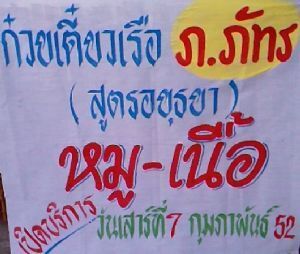 ก๋วยเตี๋ยวเรือ ภ.ภัทร (สูตรอยุธยา) เนื้อหมูแยกหม้อ ให้บริการความอร่อยหลากหลายเส้น เสริฟพร้อมกากหมูเจียวแสนอร่อย พร้อมผักสดให้บริการตั้งแต่เวลา 10.00 น. - 20.00 น. หยุดทุกวันพุธ เชิญลิ้มลองความอร่อยได้ในราคาเพียงชามละ 12 บาท พิเศษ 25 บาท สอบถามที่ 086-3321050 รับออกงานนอกสถานที่ค่ะ