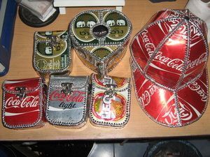 ขายกระเป๋าทำจากกระป๋องเบียร์และน้ำอัดลม หรือหมวกต่างๆตามแบบ