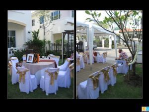 โต๊ะกลมสำหรับทานอาหาร ผ้าคลุมโต๊ะ ผ้าคลุมเก้าอี้ โบว์ทอง ร่มสนามทั้งแบบโมเดิร์น และ สไตล์สปา