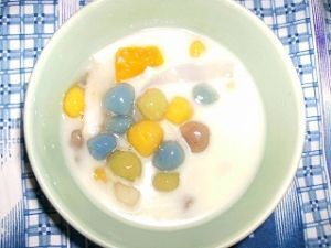 มี5สี1 เผือกสีขาว,ฟักทองสีเหลืง,ใบเตยสีเขียว,ข้าวเหนียวดำสีดำ,ดอกอัญชัญสี ม่วง(ไม่มีการใส่สีใดๆทั้งสิ้นครับ)มีเครื่องเป็นมะพร้าวอ่อนกับเผือกต้ม ครับ ส่วนน้ำกระทิใช่กระทิคั้นสดๆผสมน้ำใบเตยเพื่อความหอมอีกด้วยครับ