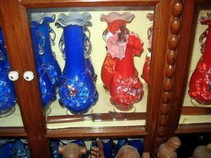แจกันโบราณ สีสดใส ฟ้า แดง ปากเป็นรูปจีบ คล้ายดอกไม้ รับรองเก่าชัวส์