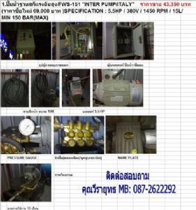 .ปั๊มน้ำฐานสกีแรงดันสูง#WS-151 "INTER PUMP/ITALY" ราคาขาย 43,350 บาท(ราคาซื้อใหม่ 69,000 บาท )SPECIFICATION : 5.5HP / 380V / 1450 RPM / 15L/MIN 150 BAR(MAX)
