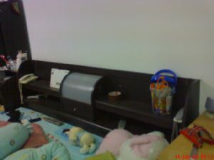 เป็นเตียงสีโอ๊คมีหัวเตียงที่หัวเตียงมีโคมไฟค่ะ (เตียงใหญ่ค่ะ)
