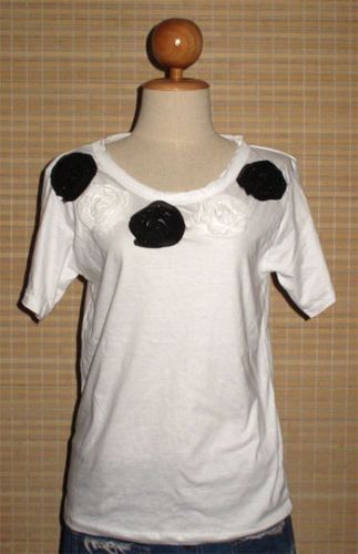 เสื้อยืดคอกลมสีขาว ปักด้วยดอกไม้สีดำ-ขาว