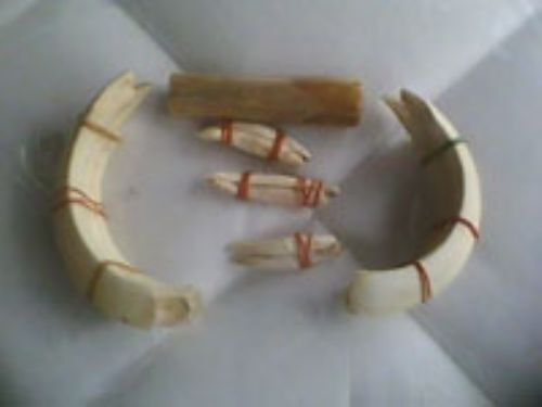 เขี้ยวหมูใหญ่ 2 คู่, เล็ก 3 คู่, ด้ามเขากวาง 1 อัน