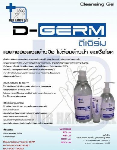 D-Germ เป็นผลิตภัณฑ์ป้องกันและกำจัดเชื้อที่ผลิตจาก Ethy Alcohal 70% ชนิดที่เป็น Foodgrade
