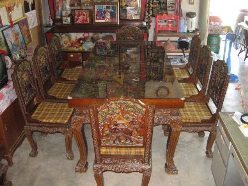 1. โต๊ะรับประทานอาหารขนาดใหญ่ จำนวน 1 ตัว แกะสลักทั้งโต๊ะ ทั้งด้านนอก ด้านบนโต๊ะ และขาโต๊ะขนาดประมาณ 98 ซม. X 204 ซม. X 82 ซม. (กXยXส) ประกอบด้วย เก้าอี้ จำนวน 8 ตัว มีพนักพิงหลัง แกะสลักทั้งตัว ความสูงวัดจากพื้นรวมพนักพิงหลังประมาณ 104 ซม.ความสูงวัดจากพื้นถึงที่นั่ง ประมาณ 45 ซม.ขนาดของพื้นที่นั่ง 46 ซม. x 48 ซม.