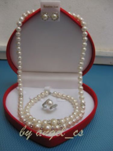ชุดเครื่องประดับไข่มุกแท้จากภูเก็ตค่ะ เซตนี้ประกอบด้วย ต่างหู สร้อยคอ สร้อยข้อมือ และแหวน สวยหรูในกล่องกำมะหยี่สีแดง รูปหัวใจ