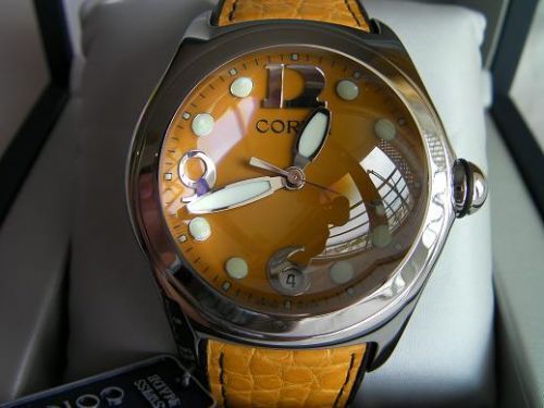 ขายนาฬิกา CORUM BUBBLE สีเหลืองสายหนังจระเข้แท้ ขนาด45mm ของใหม่พร้อมกล่องและwarranty 2 years