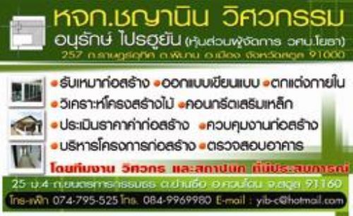 หจก. ชญานิน วิศวกรรม 257 ถ ราษราฏร์อุทิศ ต.พิมาน อ.เมือง จ. สตูล โทร 0849969980 โทร แฟ็ก 074795525