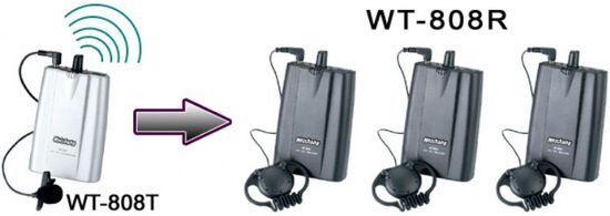 The WT-808R receiver has a hang-type earphone, simultaneously transferring 16 selectable channels and 6 channels parallel without interference. http://www.wtechasia.com/index.aspx?ContentID=ContentID-071122095409797