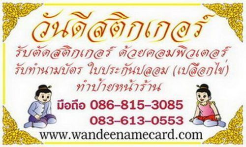 | คำค้น: | สติ๊กเกอร์ | นามบัตรธุรกิจ | นามบัตร | ที่ดินแบ่งขายราคาถูก | | ||