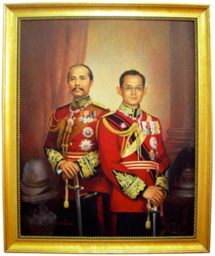 ภาพเขียนสีน้ำมัน พระบรมฉายาลักษณ์ พระบาทสมเด็จพระเจ้าอยู่หัวภูมิพล อดุลยเดชฯทรงประทับยืน คู่กับ เสด็จพ่อ ร. 5 พระบาทสมเด็จพระจุลจอมเกล้าเจ้าอยู่หัวฯ ขนาด 1.15 เมตร X 0.95 เมตร พร้อมกรอบชั้นเลิศ