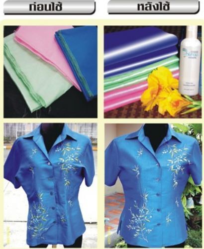 ผลิตภัณฑ์คุณภาพ Kesornไหมหอมที่ได้รับการส่งเสริมจากกรมทรัพย์สินทางปัญญา และกรมส่งเสริมอุตสาหกรรม เปิดสอนซักรีดผ้าไหมให้สวยงามได้อย่างไร ซักชุดไหมออกงานให้ดูสง่างาม ชุดไหมราตรีให้ดูพริ้วสวย สีไม่ซีดจาง คงความเงางาม ไม่ด่าง (ดูภาพเปรียบเทียบการใช้และไม่ใช้น้ำยา)