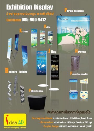 Portable Display จำหน่าย อุปกรณ์ออกบูธแบบพับเก็บได้ "สะดวกในการติดตั้ง ประหยัดในเรื่องของเวลา คุ้มค่าในเรื่องของราคา" อุปกรณ์ ดิสเพลย์ x-stand , L-banner , roll up ใช้เป็น Banner Stand สำหรับโปรโมทหน้าร้าน , pop up backdrop ใช้เป็นฉากหลังสำหรับออกบูธ Exhibition , pop up counter promotion desk ใช้เป็นโต๊ะสำหรับpresent สินค้า, bochure holder ดิสเพลย์โบว์ชัวร์ สินค้าทุกชิ้นมาตารฐานส่งออกยุโรป อเมริกา แข็งแรงทนทาน " สินค้าคุณภาพ ในราคาที่คุณพอใจ"