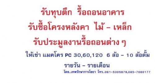 รับ รื้อถอน อาคาร รับทุบตึก รับซื้อบ้านไม้เก่า - รับซื้อไม้เก่าบ้านไม้ - รื้อถอนสะพาน - รื้อถอนตึก - รื้อถอนฐานราก - รื้อถอนโรงงาน - รับซื้อโครงหลังคาเหล็ก โกดังเก่า พร้อมรื้อถอนฟรี - รับซื้อบ้านไม้เก่า ให้ราคาสูง พร้อมรื้อถอนฟรี - รื้อถอนสิ่งปลูกสร้างทุกชนิด - รับงานเคลียริ่ง ปรับพื้นที่ ขนย้ายวัสดุต่างๆ -รับถมที่ มีรถแบ็คโฮให้เช่า - รับถมที่ สร้างเขื่อนคั้นคันดิน - งานใกล้-ไกล เราไปได้ทุกที่ ทุกเวลา