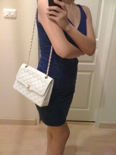 กระเป๋า หนังสีขาว ขาวมากๆ ไม่เหลืองหรือมีรอยด่างเลยค่ะ หนังสภาพดีมากนุ่มค่ะ สภาพดีค่ะ90% มีตำหนิเป็นจุดแดงๆนิดหน่อยด้านในกระเป๋าค่ะ ตามรูปนะคะ แล้วก็เป็นรอยเปื้อนตรงด้านในกระเป๋าตรงฐานในกระเป๋าที่ใส่ของนะค่ะ ตามมุมมีเปื้อนนิดหน่อยค่ะมองไม่ค่อยเห็น โซ่ทองยังวิ้งมากค่ะ สายโซ่ก็ไม่ดำนะคะ