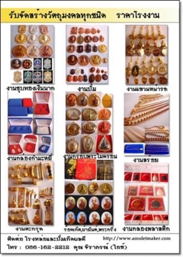 ไม่ว่าจะเป็น งานผ้ายันต์,งานร๊อคเก็ตหินอ่อนแบบต่างๆ,งานเข็มกลัดติดเสื้อแบบต่างๆ,งาน หล่อพระกริ่ง,หรือองค์พระตัวโลหะแบบต่างๆ ไม่ว่าจะเป็นเงิน ทองเหลือง,งานหน้ากาก,งานทำพิมพ์,งานฐานองค์พระพลาสติก,งานครอบแก้ว,งานกำไล ทอง เงิน นาก หรือสามกษัตริย์,งานแหวนทอง ซึ่งทางเราจะนำงานใหม่ๆ ขึ้นตลอดเวลาท่านสามารถติดตามงานของทางโรงงานได้ตลอด ทาง www.amuletmaker.com อย่าลืม Bookmark ไว้นะค่ะ