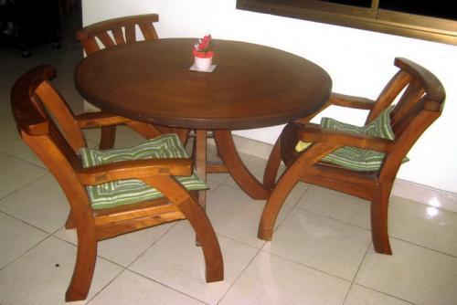 ขายโต๊ะอาหารกลม ไม้สักล้อเกวียน เก้าอี้นั่ง 5 ตัว ราคา 23 000 บาท