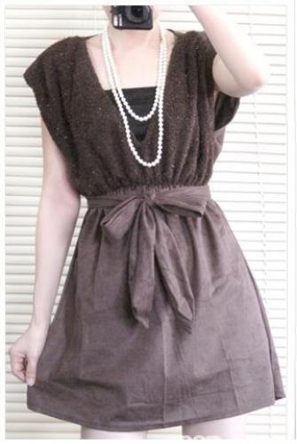 เดรสผ้าขนนุ่มผสมดิ้นทองแว๊บๆมีซับใน สีน้ำตาล