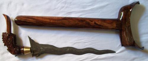 กริชหัวนกพังกะทำจากแก่นไม้มะปริง ใบเหล็กผสมมี7คตยาว10นิ้ว มีลายท้องงู น้ำไหล ไหมพุด ฟันปลา และเท้าช้างเล่มนี้เท้าช้างสวยมากครับ ฝักทำจากแก่นไม้มะปริงเช่นกัน เมื่อสวมฝักยาว17นิ้ว ในปัจจุบันไม่มีช่างผลิตใบกริชผสมแล้วเป็นที่น่าเสียดายมาก ราคา4300บาท
