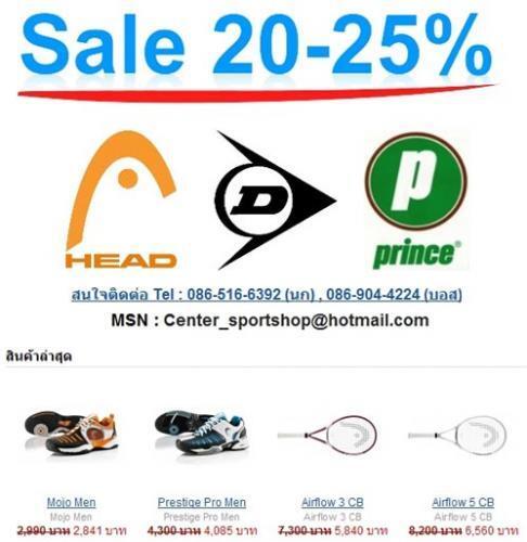 อุปกรณ์เทนนิส Brandname ราคาพิเศษ ยี่ห้อ Head Dunlop Prince ไม้เทนนิส รองเท้าเทนนิส กระเป๋า Tennis ลดสูงสุด 20-25เปอร์เซ็น ที่ http://www.CENTERSPORTSHOP.com