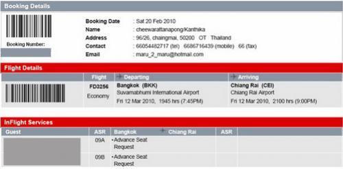 ด่วน!ขายต่อตั๋วเครื่งบิน Air asia กรุงเทพ-เชียงราย2ที่นั่ง เที่ยววันที่ 12/03/2553 เวลา19.45น. ราคา3