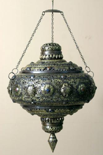 เป็นโคมไฟนำเข้าจากต่างประเทศทำมาจากทองเหลืองผสมทองแดงฉลุลายติดลูกปัดหลาก สีเมื่อเปิดไฟจะมีแสงไฟทะลุผ่านลายฉลุจะทำให้ห้องดูสวยงามมากขนาด ความสูง21"ความกว้าง 17" เหมาะกับบ้านทุกแบบทุกสไตล์การตบแต่ง