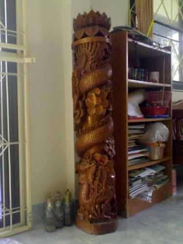 ไม้สักท่อนทองท่อนเดี๋ยว สูง 115 ซม.เส้นผ่าศูนย์กลาง 25 ซม. แกะสลักเป็นรูปมังกรพันเสา ข้างบนเป็นรูปดอกบัว (อยากดูรูปหลายด้านส่งอีเมล์มาจะส่งไปให้ดู) แกะสลักมานาน 35 ปี