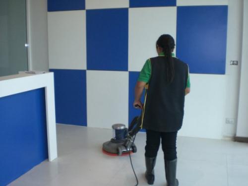 - ล้างพื้นให้สะอาดด้วยเครื่องขัดพื้นและน้ำยาล้างพื้นทั่วไป