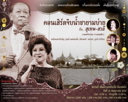 WeBooking เชิญท่านร่วมจิบน้ำชายามบ่ายผ่อนคลายด้วยเสียงเพลง ครื้นเครงด้วยรอยยิ้ม เต็มอิ่มกับความสุขกับคอนเสิร์ตสุเทพ-สวลี ในบรรยากาศสบายๆ ริมแม่น้ำเจ้าพระยา ร่วมด้วยศิลปินรับเชิญมากมาย