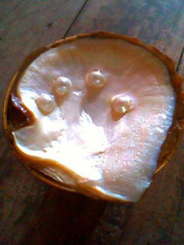 หอยมุกฝาเดียวอายุ 25 ปี มีไข่มุกติดอยู่ที่ฝาหอยมุก 4 เม็ด