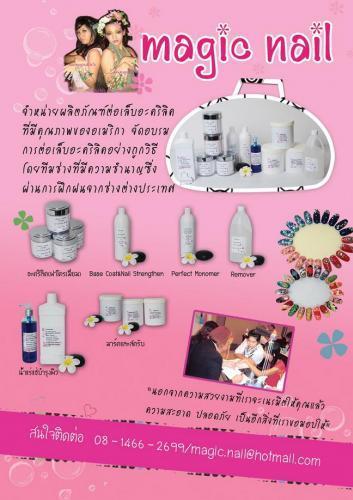 Magic Nail จำหน่ายอุปกรณ์ต่อเล็บอครีลิค� , ต่อเล็บเจล� , Soak off� gel� , Polish gel ของ USA ที่มีคุณภาพ ผ่านการทดสอบการใช้งาน เพราะมีร้านเปิดให้บริการ� สั่งสินค้าจำนวนมากรับราคาพิเศษ พร้อมรับการฝึกอบรมการใช้อุปกรณ์ และการต่อเล็บ ฟรี� โดยทีมช่าง ที่ผ่านการอบรมจากช่างต่างประเทศ � สนใจติดต่อ โทร.081-466-2699