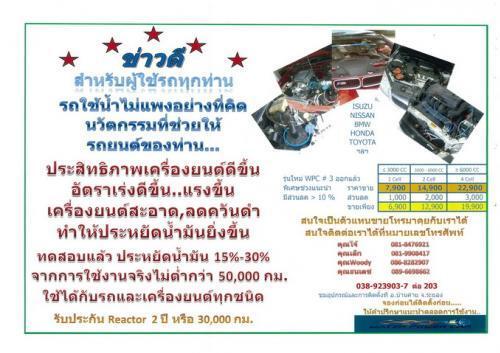 รถใช้น้ำ...สุดประหยัด...โค..ตะระ..ๆๆๆ ค้นคว้า, ทดลองและผลิตโดยวิศวกรคนไทย เพื่อคนไทยจะได้ใช้ของดี ราคาถูก ทำให้ประสิทธิภาพของเครื่องยนต์ดีขึ้น อัตราเร่งดีขึ้น..แรงขึ้น เครื่องยนต์สะอาด ลดควันดำ ประหยัดน้ำมันยิ่งขึ้น ทดสอบแล้วจาการใช้งานจริงกว่า 50,000กม. ประหยัดน้ำมัน 15เปอร์เซ็น -30เปอร์เซ็น (แล้วแต่ชนิดของเครื่องยนต์) ใช้ได้ทั้งรถเบนซิน, ดีเซล, LPG, NGV รถเล็ก รถใหญ่ ใช้ได้ทั้งหมด โดย WPC#3 เราใช้น้ำเปล่าเท่านั้น และเรายังเลือกใช้อุปกรณ์ที่มีคุณภาพสูง เช่นตัว Casting เป็น Stainless Steel ตัว Reactor ด้านในเป็น Titanium คุณภาพสูงลดการกัดกร่อนจากการทำปฏิกิริยา ทำให้น้ำไม่มีสีแดงขุ่นจากสนิมเหล็ก ใช้งานได้นานไม่ต้องเปลี่ยนน้ำบ่อยๆ แค่ตรวจระดับน้ำและเติมน้ำประมาณ 100-200 CC ทุกๆ 1,000 กม. มีระบบป้องกันไฟลัดวงจร ติดตั้งสวิทช์ ปิด-เปิด ภายในรถยนต์ มีแอมป์มิเตอร์ดิจิตอลให้ใช้ตรวจวัดกระแส โดยปกติจะใช้กระแสอยู่ที่ 1-2 แอมแปร์ เท่านั้น (ไม่ควรเกิน 3 แอมแปร์) มี 3 รุ่นให้เลือกแล้วแต่ขนาดรถ (ราคารวมติดตั้ง)
