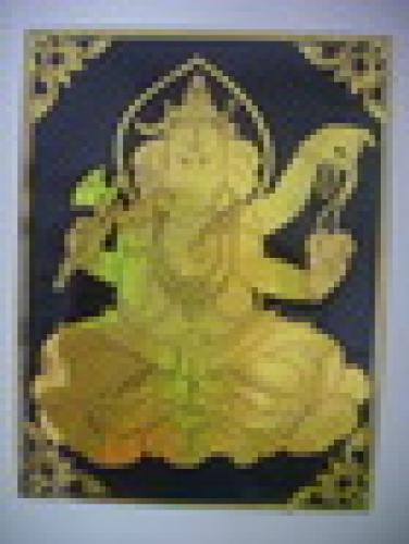 ภาพพระพิฆเนศสีทองเลื่อม เป็นภาพแกะจากสติกเกอร์สีทองเลื่อมพื้นสีดำ ขนาด21x28 นิ้ว ยังไม่มีกรอบ ทำด้วยมือ ตั้งแต่วาดแล้วแกะ งานละเอียดประณีต