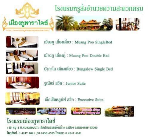 เมืองภูพาราไดซ์ : 165 หมู่ 8 บ.หนองกอมเกาะ ติดกับตลาดแจ้งสว่าง อ.เมือง จ.หนองคาย 43000