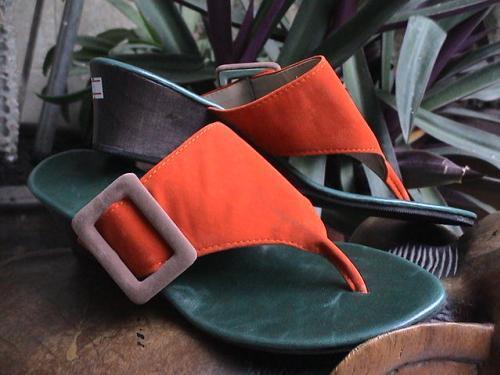 รองเท้าส้นตันสูง 2นิ้ว ผ้าสักหลาดสีส้ม พื้นรองเท้าสีเขียว