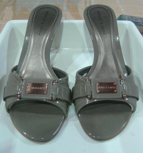 รองเท้าส้นสูง CHARLES & KEITH สีเทา หนังเงา มีป้ายเหล็กบอกยี่ห้อรองเท้าที่ด้านหน้า ส้นไม่สูงมาก ประมาณ 2 นิ้วครึ่ง ใส่สวยมากค่ะ